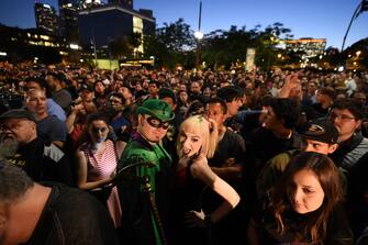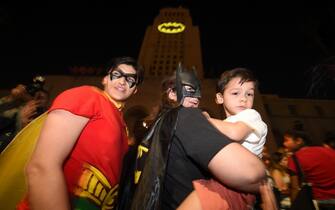 Moltissimi fan si sono radunati sotto il municipio per assistere all’evento. Nell’immagine un ragazzo vestito da Joker e una ragazza nei panni di Harley Quinn - È morto Adam West, addio al primo Batman della tv