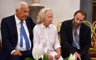 "Sarebbe felicissimo dell'addio in Campidoglio e soprattutto della presenza di tutte queste persone, mi diceva sempre che la vera sfortuna è morire durante i mondiali perché non ti si fila nessuno" racconta il figlio Pierfrancesco- Nella foto la moglie dell'attore, Maura Albites, con il figlio Pierfrancesco e Paolo Fresco - Le parole del figlio