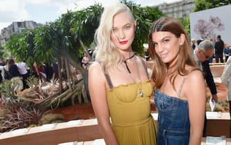 Chioma biondo platino e lungo abito color senape per la top model Karlie Kloss, che ha posato per i fotografi insieme alla modella e attrice Bianca Brandolini D'Adda - Lo street style della Milano Fashion Week 2017