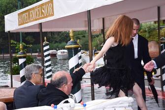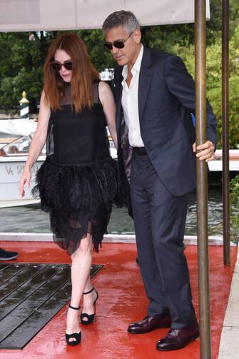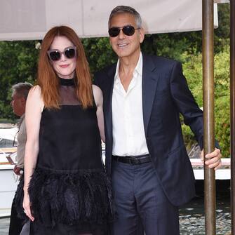 Al suo fianco, in queste immagini dell'arrivo al Lido, nel primo giorno di pioggia di questa 74esima edizione, anche l'attrice protagonista Julianne Moore, che sul pontile del Lido ha rischiato di finire in acqua!