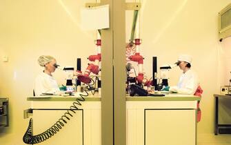 Mostra "La rivoluzione silenziosa. Donne e lavoro nell’Italia che cambia", a cura di Tatiana Agliani, al Ma.Co.f., dal 2 maggio al 31 luglio. In foto: tecniche dell’area fotolito e controllo nella camera pulita dell'azienda spaziale Thales Alenia Space, L'Aquila, 2014 (Foto: Stefano D'Amadio / BuenaVista Photo)