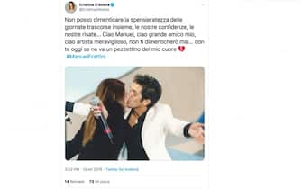 Con una foto di un momento condiviso insieme sul palco, anche Cristina D'Avena ha ricordato su Twitter il collega. "Non posso dimenticare la spensieratezza delle giornate trascorse insieme - scrive -Non ti dimenticherò mai, con te se ne va un pezzettino del mio cuore" (foto Twitter/Cristina D'Avena)