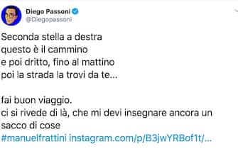 Il dee jay Diego Passoni ha invece scelto una strofa della canzone "L'isola che non c'è" di Edoardo Bennato per ricordare il "Peter Pan" del musical. "Fai buon viaggio. Ci si rivede di là, che mi devi insegnare ancora un sacco di cose" (foto Twitter/Diego Passoni)