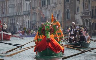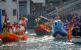 Dopo il consueto alzaremi davanti al Ponte di Rialto, tante barche colorate - ognuna "travestita" con un tema differente, dal gallo al gabbiano, dal drago al delfino - hanno sfilato fino al gran finale a Cannaregio. Suggestivo lo "Svolo della Pantegana" di cartapesta