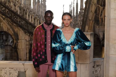 Dal completo giacca e pantaloni in tessuto jacquard verde menta, abbinato a una camicia bianca con cravatta-foulard floreale, fino ad arrivare all’abito tempestato di paillette blu elettrico, ogni capo di questa capsule è un tassello fondamentale per comporre fashion puzzle dall’irresistibile gusto rock ’n’ chic.