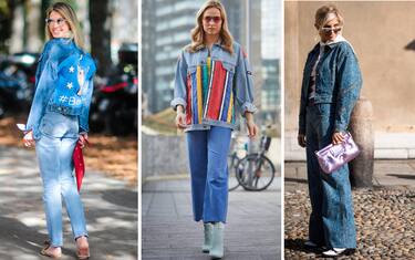 Oltre al total denim, optate per il total denim decorato con lo stesso motivo per strafare. Una pochette in satin impreziosirà il look, rendendolo meno casual