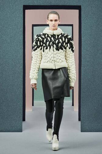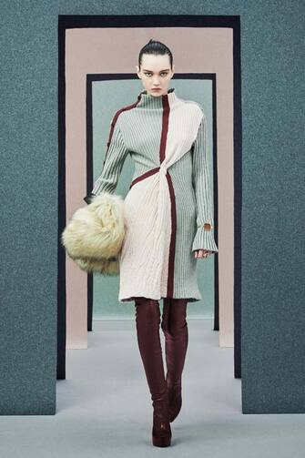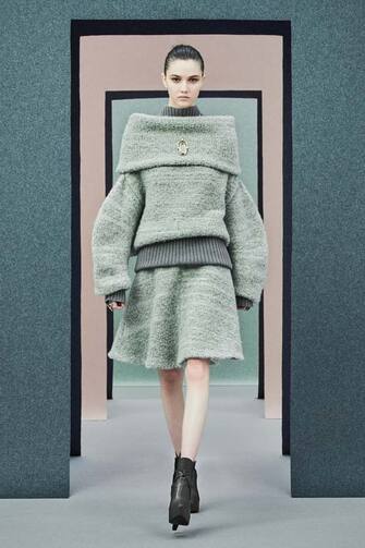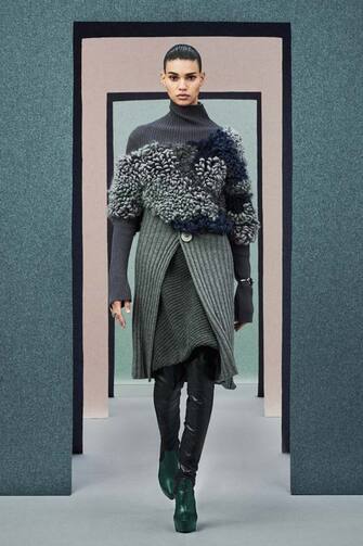 La maglieria racchiude la ricerca di agio in un abbraccio protettivo: un maglione in lana intrecciata con la pelle; ciuffi pelosi su un cappotto accogliente, una gonna a coste drappeggiata sui fianchi