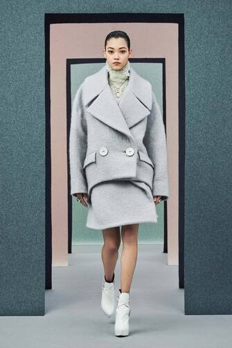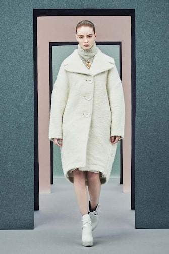 Cappotti scultorei che si sbottonano sul retro; trenchi fluenti; abiti drappeggiati; maglioni spessi come capispalla