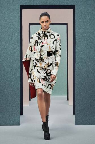 L’atto di avvolgere suggerisce modi per costruire i capi, mentre le stampe grafiche lo evidenziano. I tocchi di pelliccia sintetica aggiungono ulteriore tattilità. La pelle è liscia