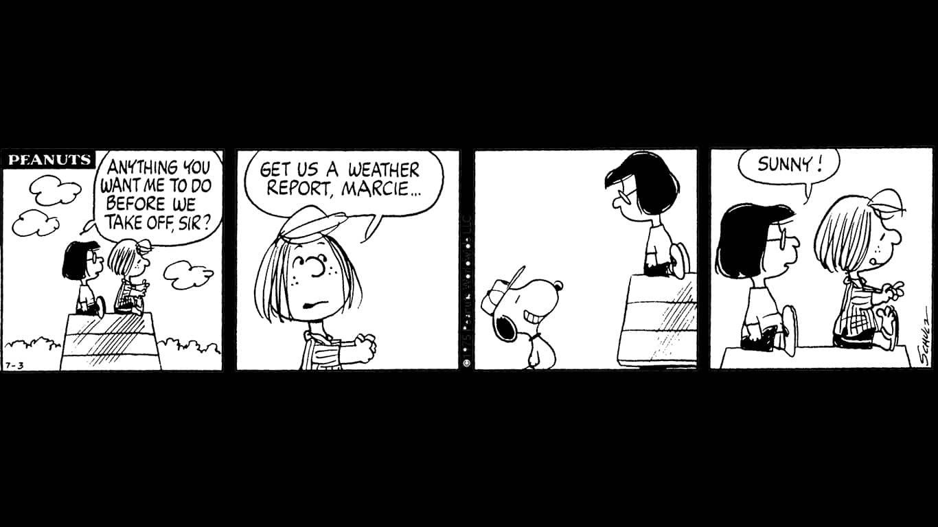 Jean :Mio marito usava tutto quello che lo circondava come ispirazione: prendeva spunto da tutto e poi lo elaborava in modo del tutto inaspettato. Io e mia mamma nel 1975 partecipammo al Powerf Puff Derby, una gara di aviazione femminile. Ci sono quindi queste strisce con Piperita Patty e Marcy che vogliono partecipare al Derby come abbiamo fatto noi, ma la loro versione fu una totale sorpresa: in questo caso pensano di volare sulla cuccia di Snoopy e una delle due, Marcy, odia volare!