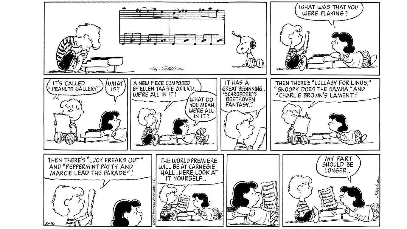 C’è un altra donna famosa nelle nostre strisce la compositrice Ellen Taffe Zwillick, la prima donna a vincere un premio Pulitzer per la musica. Sparky la mise nelle sue strisce e si conobbero. Ora lei è la compositrice in residence della Santa Rosa Simphony proprio qui dove siamo noi e il museo. E’ come se le cose che gli interessavano e toccava continuassero ad avere effetti sempre più profondi nel tempo, un po’ come quando lanci un sassolino nell’acqua