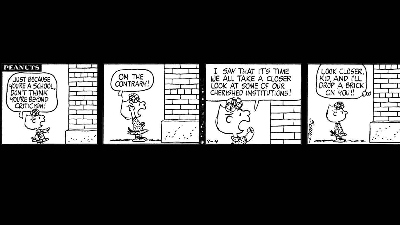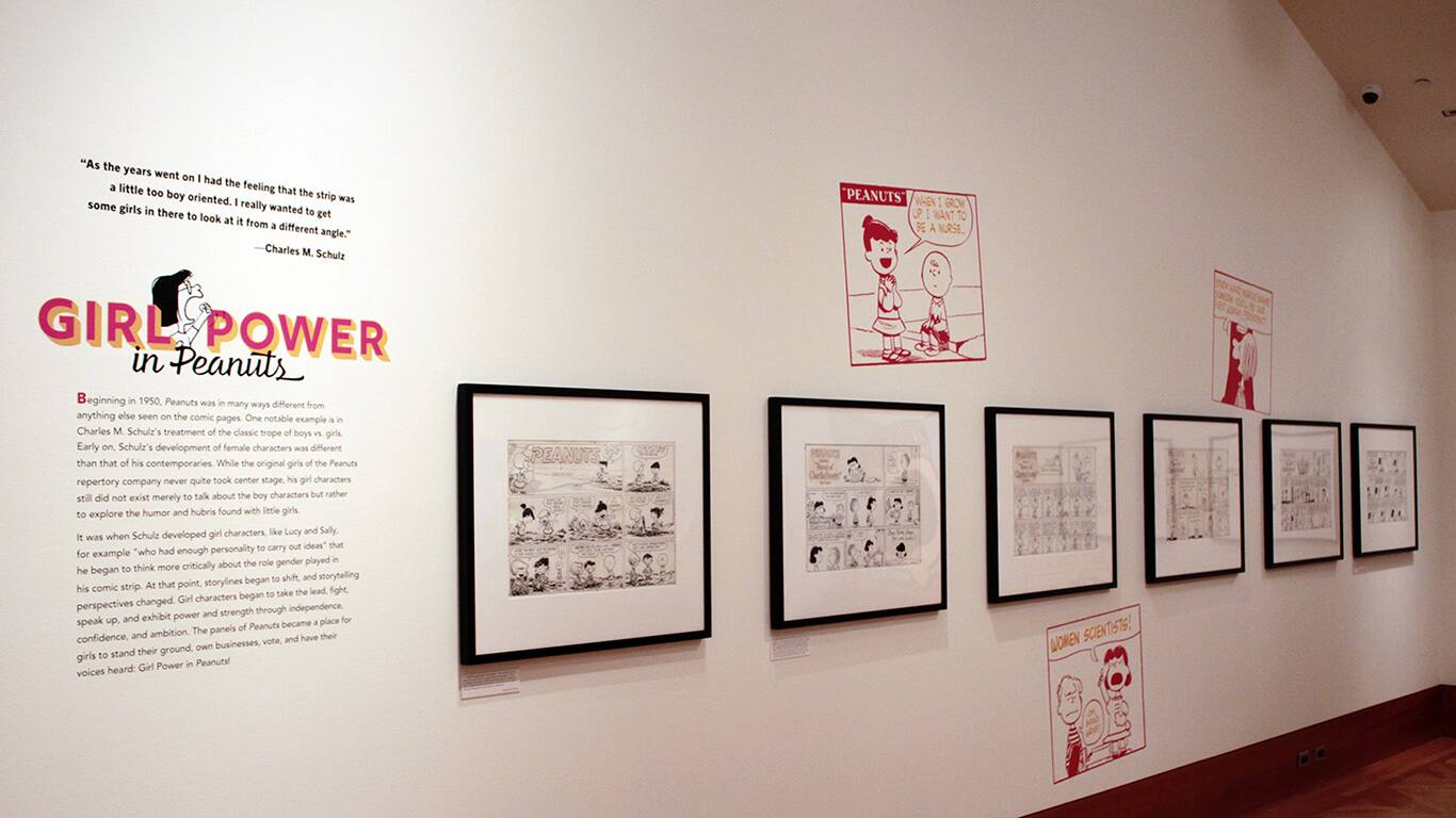 Una nuova mostra apre al Santa Rosa Peanuts Museum: Girl Power in Peanuts: ne racconta i personaggi femminili, dai primi poi scomparsi dalle strisce come Violet e Patty, a Lucy, Piperita Patty, Sally e Marcy. Il museo è il lavoro d’amore ventennale di Jean Shultz, che aveva iniziato a curarlo quando Charles era ancora in vita. Charles Schulz mori nel sonno più di 20 anni fa. Nel 1991, riflettendo sul suo lavoro, disse.”Ad un certo punto mi sono reso conto che il mondo dei Peanuts era troppo maschile: ho creato quindi dei personaggi femminili per cambiarne la prospettiva.” Di prospettive sovversive in quelle strisce se ne trovano tante: le bambine non sono oggetti decorativi; sono al centro dell’azione, sono sportive, piccole imprenditrici, dicono quello che pensano, o semplicemente bistrattano il povero Charlie Brown.