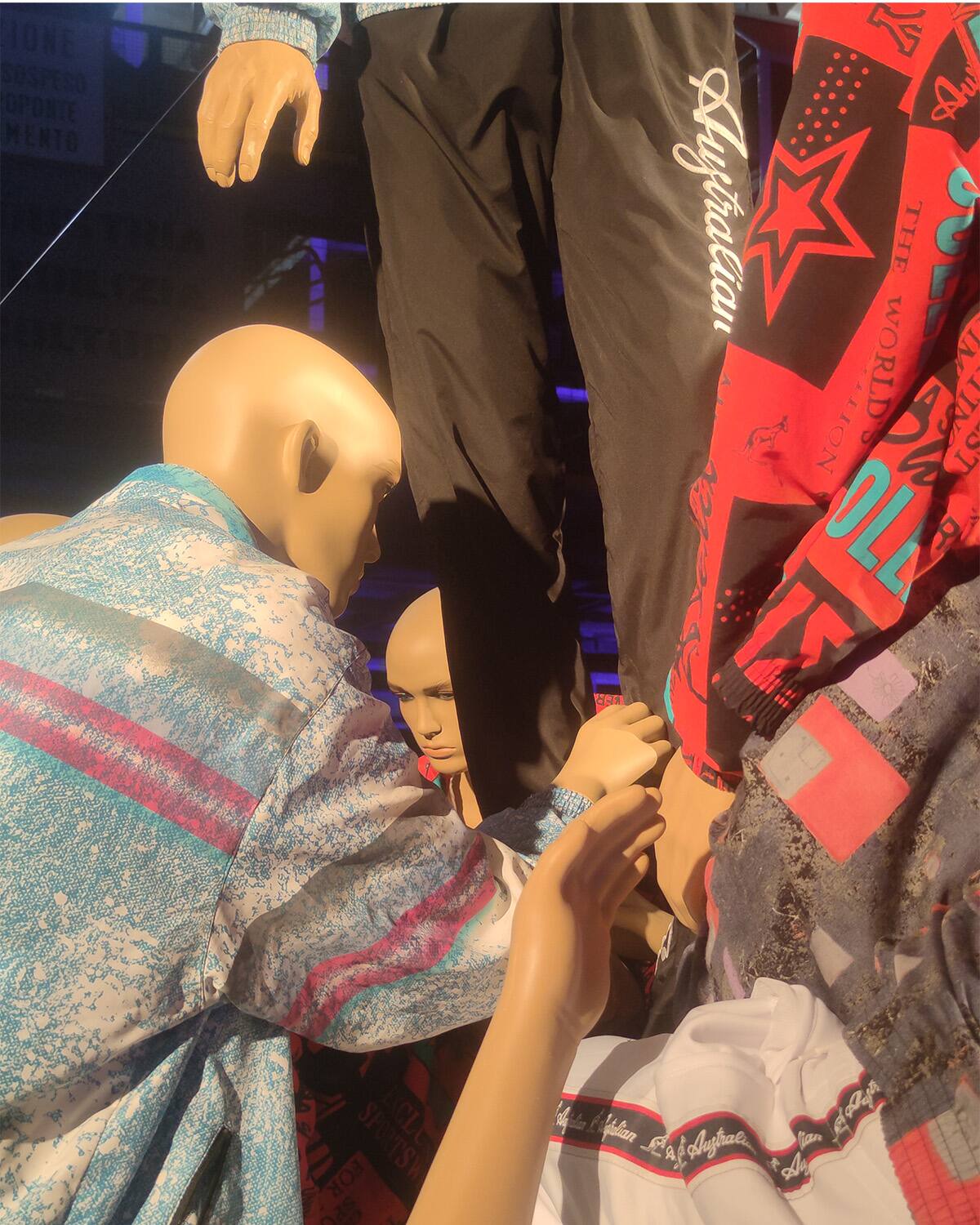 Assieme al video, Weik presenta un’istallazione statica formata da un accumulo di manichini in scala 1:1 con outfit del marchio Australian by l’Alpina, la più famosa marca nel panorama gabber.