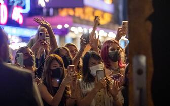I fan urlano e scattano foto mentre gli attori escono dalla porta del palco dopo la riapertura di Hamilton al Richard Rodgers Theatre di New York