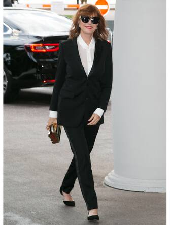 L'attrice di cui parlavamo è Susan Sarandon. Eccola con un completo nero composto da giacca e pantaloni e sotto una camicia bianca