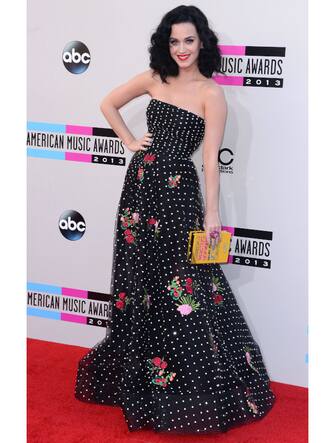 Ed ecco Katy Perry con un abito lungo che mescola proprio le due stampe del cuore: polka dot e flower