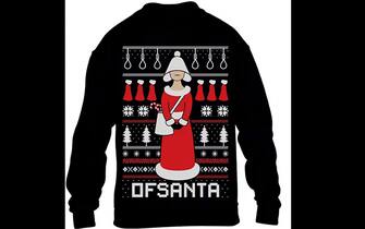 È un po' natalizio e un po' macabro l'omaggio a The Handmaid's Tale, che d'altronde non è di certo una serie comica con la sua Gilead dove le donne sono brutalmente soggiogate e non possono lavorare, leggere o maneggiare denaro. Così sulla felpa l'abito rosso dell'ancella diventa quello di Babbo Natale, il volto rimane coperto, e spuntano anche qualche cappio e l'inequivocabile nome OfSanta