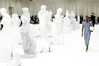 Sfila sabato 26 febbraio in uno spazio industriale riempito di copie di statue antiche, la collezione Jil Sander disegnata da Lucie e Luke Meier. Stampe per la prossima stagione su cappotti matelassè e abiti di seta.