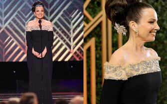 L'attrice Cate Blanchett, chiamata a consegnare il premio alla carriera a Helen Mirren, ha accolto la collega sul palco in Armani Privé, il suo marchio prediletto. La sua apparizione in abito fasciante a sirena e con una scollatura profonda, è in linea con lo stile Old Hollywood tanto amato dalla diva che ha messo in mostra un gran numero di coloratissimi anelli da cocktail by Pomellato