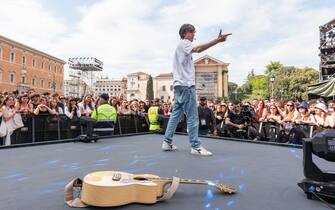 Max Pezzali ha intrattenuto il pubblico di piazza San Giovanni a Roma, mentre in tv andava la pubblicità. A cappella, il cantante ha intonato - seguito a gran voce dalla piazza - "Gli anni", prima poi di proporla nuovamente con la band in diretta tv. Dopo ha cantato anche "Con un deca"
