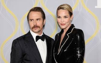Gli attori Sam Rockwell e Leslie Bibb posano insieme per i fotografi all'ingresso. Per lei, un completo con giacca in paillettes all over e bordi luminosi a contrasto di Pamela Roland