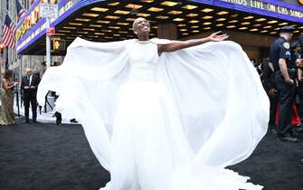 Entrata da cigno per Cynthia Erivo in Giambattista Valli, un modello con spalle a mantella della collezione Spring Summer 2022. Gioielli in oro Tiffany, style di Jason Bolden