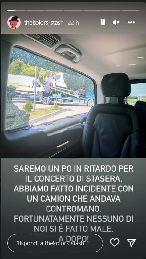 Nel messaggio lanciato ai fan, Stash ha avvisato del ritardo che avrebbe subito l’inizio del live, rassicurando però tutti sulle condizioni dei membri della band: “Stiamo tutti bene”. I The Kolors sono attualmente impegnati in una tournée nazionale dopo lo stop forzato causa Covid. Stash è reduce anche dall’impegno come giudice di Amici e di recente è stato ospite a Milano del concerto dei Sottotono.