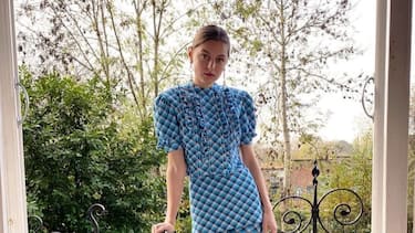 Su Vogue indossa un abito elegante con sotto una canotta bianca, firmati Louis Vuitton.