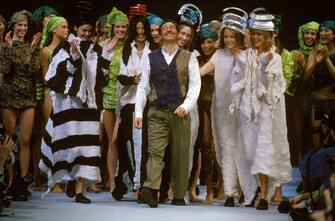 Nella sua brillante carriera, l'artista, noto a livello internazionale per le sue creazioni che combinano la tradizione giapponese con materiali e tagli all'avanguardia, è stato un autentico pioniere che ha sempre saputo guardare oltre i confini tracciati dal suo tempo Nella foto, Issey Miyake e le top model sulla passerella per la collezione Autunno/Inverno 1993/1994 a Parigi
