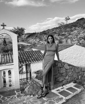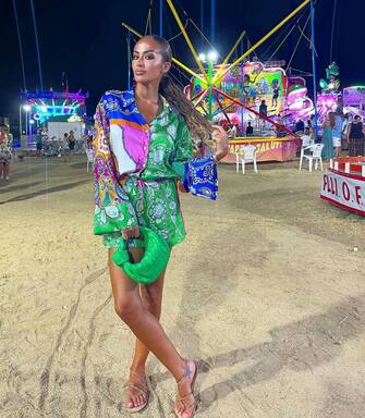 Federica Nargi al tramonto con un vestito lungo elegante e delle infradito allacciate alla caviglia