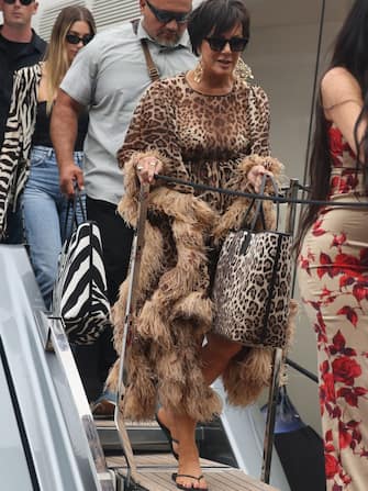 Kris Jenner mentre scende dallo yacht a Portofino indossa un abito leopardato e ai piedi un semplice paio di infradito nere