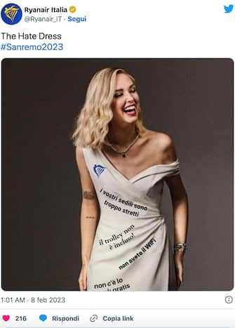 Ryanair Italia ha usato l’Hate Dress di Chiara Ferragni per un tweet pieno di autoironia. Foto da Twitter/Ryanair_IT