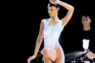 Bella Hadid, l'abito spruzzato sul corpo sfila a Parigi. VIDEO