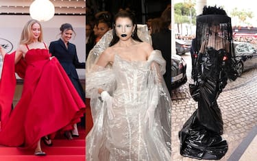 Julia Fox, sulla Croisette in questa seconda metà di Festival, ha fatto sfoggio sul tappeto rosso della sua personalità eccentrica attraverso outfit come sempre notevoli al limite del bizzarro. Per l'anteprima di The Idol, la star americana ha indossato un abito da sera dal taglio couture (con tanto di struttura bustier a vista e soprabito a strascico) interamente realizzato in plastica doppiata. Bianco come il dress anche il makeup, con labbra scure verniciate su un viso pesantemente incipriato, l'ultima ossessione della Fox