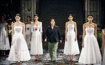 Colpo d'occhio del finale del fashion show che si è svolto nel cortile del Colegio de San Ildefonso, ex convento gesuita dove Frida Kahlo si formò e dove conobbe Diego Rivera, l'uomo che amò per tutta la vita