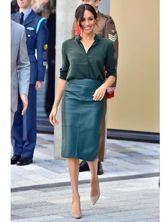 Non solo abiti: Meghan Markle adora anche i completi e pure gli spezzati. Eccola con una gonna a matita in pelle verde smeraldo con sopra una blusa in seta verde muschio.
