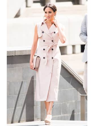 Meghan Markle con un abitino molto originale: un vestito che sembra un trench, senza maniche e con i dettagli tipici del soprabito inglese.