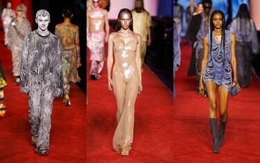 Lo slip è l'elemento chiave di questi abiti, tono su tono o a costrasto. L'imperativo è sedurre in maniera sfacciata. Il beauty look con la pelle argentata e bronzata strega il pubblico della Fashion Week