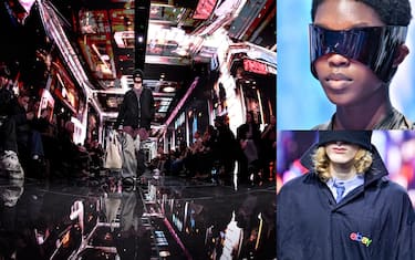 Gli occhiali da sole sono sempre accessorio di punta delle collezioni Balenciaga. Qui lo stilista spinge all'estremo l'idea di visiera di stampo sci-fi che era stata lanciata già nelle passate collezioni. Le lenti diventano tutt'uno col viso e la testa, sempre più avvolgenti
