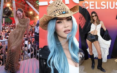 Megan Fox - Look da cartoon cowgirl per Megan Fox, una delle protagoniste del primo weekend del Coachella Valley Music and Arts Festival 2024 caratterizzato da concerti e feste scatenate. L'attrice, che per l'evento ha sfoggiato una chioma lunga e azzurra, ha indossato shorts in denim con una canotta a coste e una giacca biker oversize. Gli accessori sono un cappello in paglia lavorato con pietre dure e stivali alti sulla coscia peep toe. Il consueto mix di originalità e seduzione