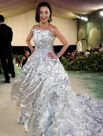 Balenciaga è anche il brand di riferimento di Michelle Yeoh che è testimonial ufficiale del marchio disegnato da Gvasalia. L'attrice premio Oscar cavalca il trend metal e arriva a New York con l'abito da gran sera lavorato in maniera stropicciata