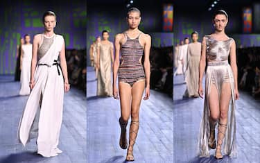 Maria Grazia Chiuri (nella foto, al termine della sfilata) ha deciso di esplorare una nuova frontiera dell'emancipazione della donna attraverso il corpo. La coincidenza coi Giochi Olimpici di Parigi è lo spunto per un tuffo nell'antichità, quando le donne venivano educate all'allenamento senza poter partecipare alle competizioni, riservate agli uomini. Lo sport, col tempo, ha contribuito a smantellare barriere sessiste. L'ispirazione dei look in passerella si trova nelle raffigurazioni delle donne sportive dell'epoca classica