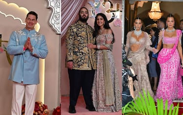 In questa foto gli sposi, Anant Ambani e Radhika Merchant a una cerimonia che si è tenuta a Mumbai a inizio luglio. I festeggiamenti per le nozze dei due rampolli sono iniziati lo scorso inverno, quando è stata data la notizia del fidanzamento. Gli sposi hanno aggiunto alla tradizione del loro Paese una buona dose di glamour. Lo stilista indiano Manish Malhotra si è occupato dell'evento (e di molti abiti della famiglia Ambani) in qualità di direttore creativo