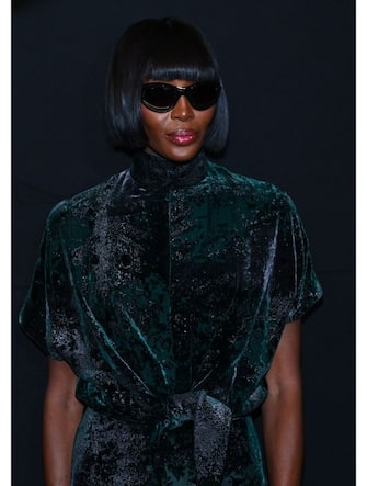 Questa, invece, è Naomi Campbell col look scelto per lo show di Roberto Cavalli, un dress in velluto dévoré a cui ha abbinato occhiali da sole dalle lenti scurissime e una pettinatura liscia con la frangia