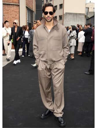 Tra gli ospiti di Tod's, primo appuntamento di venerdì 20 settembre, c'è Mahmood, con un completo color sabbia dal taglio ampio e lineare, con la giacca con le tasche applicate sulla parte frontale