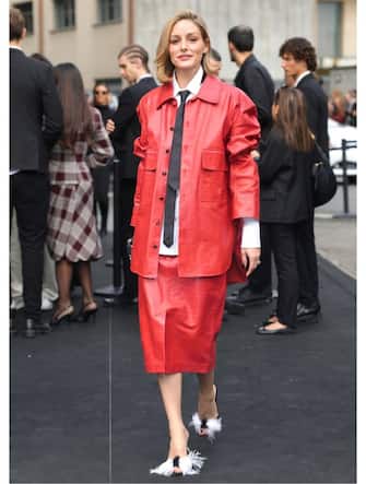 Olivia Palermo ruba la scena in rosso da Tod's, con uno stile che mette insieme diverse tendenze: dal completo in pelle, alle mules decorate, alla cravatta, tocco da vera fashion icon