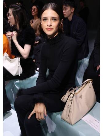 In total black, e con una borsa a spalla in nylon, un modello da giorno del brand molto versatile, Benedetta Porcaroli, qui in attesa del fashion show di Prada