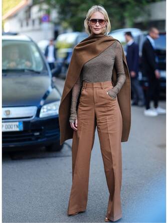 La maxi sciarpa indossata come un drappo sulle spalle. Poppy Delevingne, a Milano prima di partecipare alla sfilata di Philosophy by Lorenzo Serafini, dà lezioni di stile per le strade della città