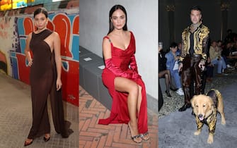 In abito lungo, Gaia Girace da The Attico. Drappeggi anche per Denise Capezza ma da Versace. Allo stesso fashion show anche Fedez col suo golden retriever Silvio (con outfit coordinato)