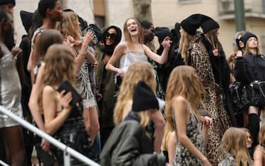 Stefano Gabbana e Domenico Dolce salutano il pubblico al termine della sfilata mentre sul led wall alle loro spalle, scorrono le immagini in diretta della festa scatenata delle modelle radunate sulla passerella esterna, in Via Piave. Si chiude così, tra applausi e musica dance